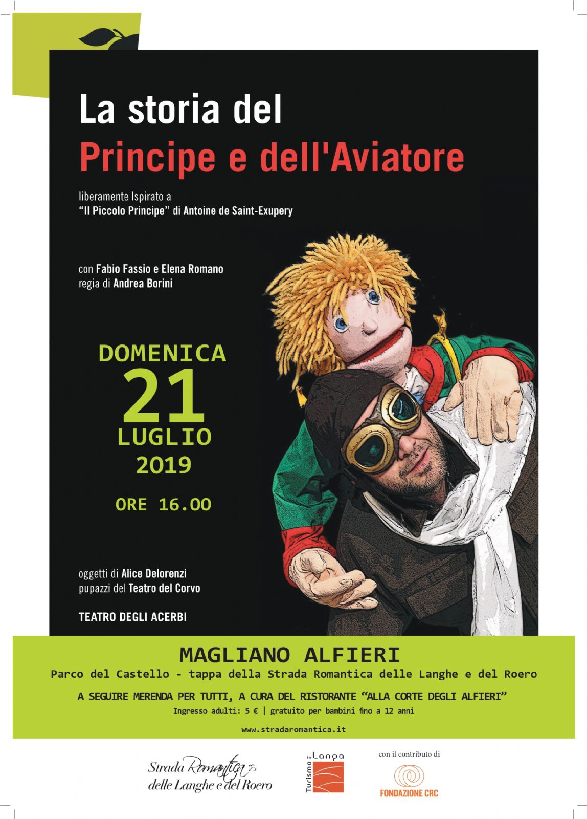 Domenica 21 luglio 2019 alle 16.00 il Teatro degli Acerbi si esibisce a Magliano Alfieri, nel parco del Castello, punto tappa della Strada Romantica, con lo spettacolo “La storia del Principe e dell’Aviatore”.