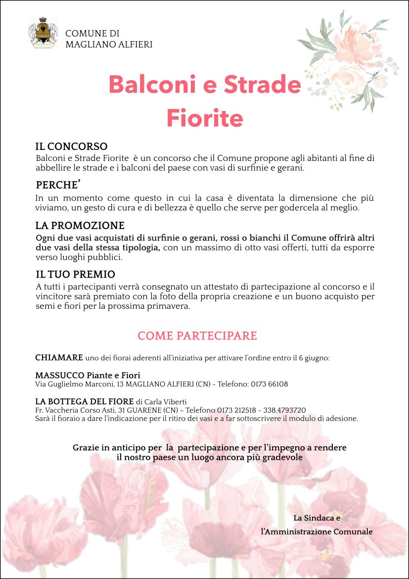 Il Comune di Magliano Alfieri dà il via all’iniziativa Balconi e Strade fioriti, volta ad agevolare la messa a dimora di fiori in vaso sulle abitazioni private che si affacciano sulle vie e piazze pubbliche.