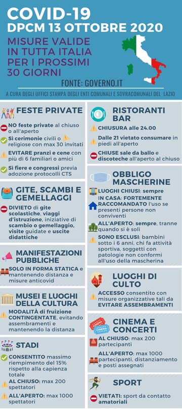 Con l'entrata in vigore del Decreto del Presidente del Consiglio dei Ministri del 13/10/2020, a partire dal 14 OTTOBRE 2020 entrano in vigore nuove prescrizioni