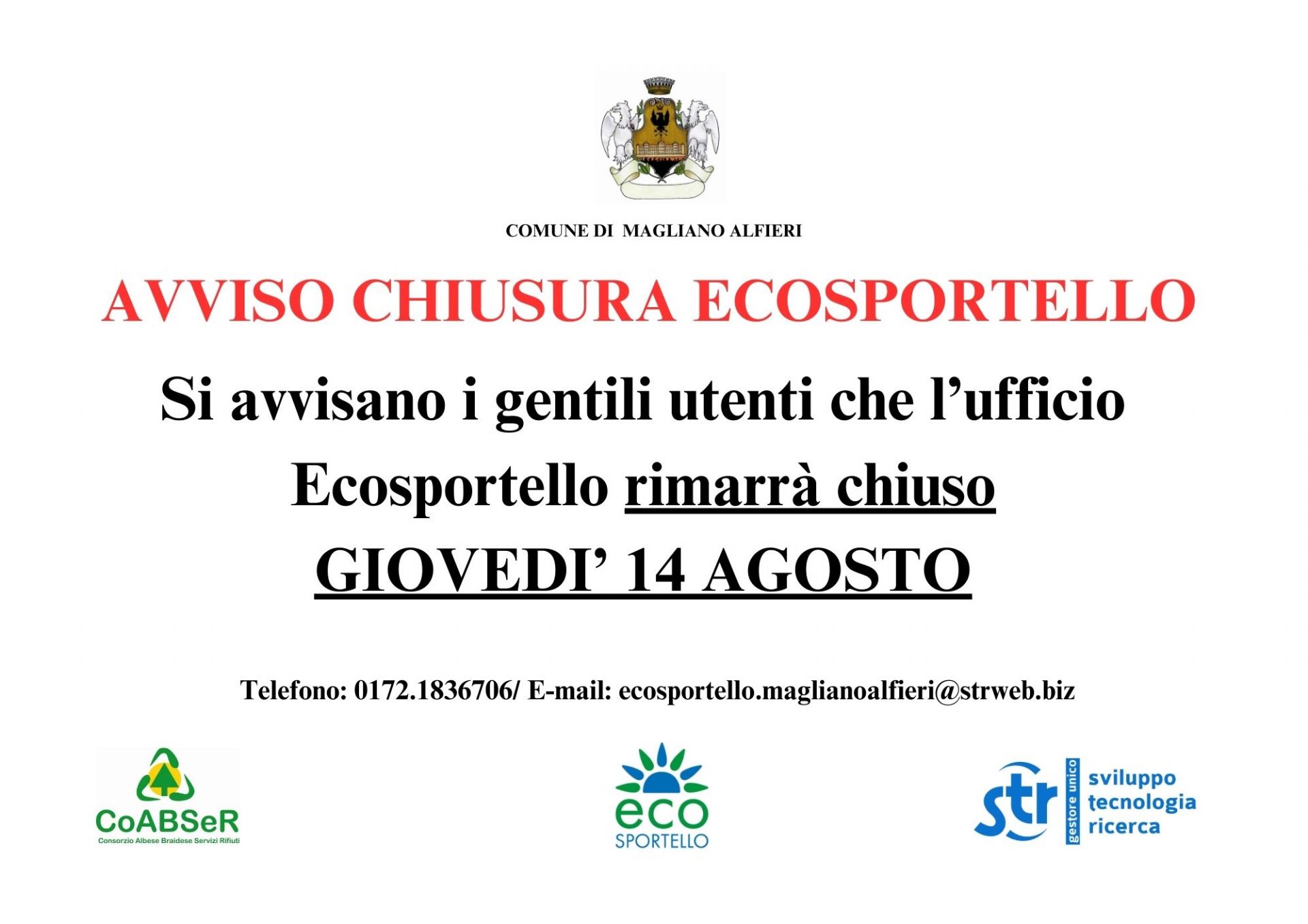 Si avvisano i gentili utenti che l’Ecosportello rimarrà chiuso GIOVEDI’ 14 AGOSTO